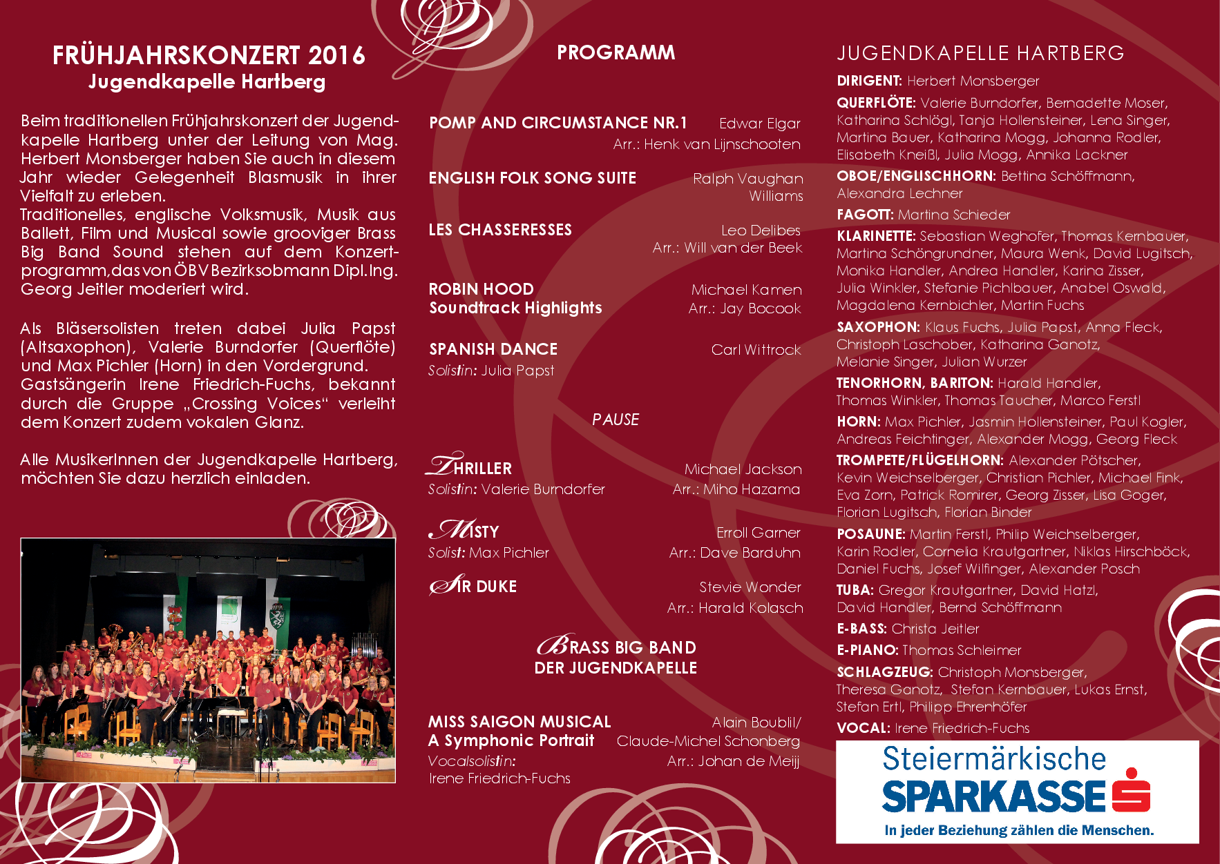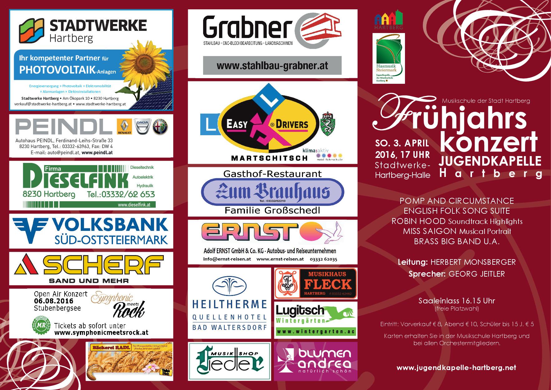 Beim traditionellen Frühjahrskonzert der Jugendkapelle Hartberg unter der Leitung von Mag. Herbert Monsberger haben Sie auch in diesem Jahr wieder Gelegenheit Blasmusik in hrer Vielfalt zu erleben. Traditionelles, englische Volksmusik, Musik aus Ballett, Film und Musical sowie grooviger Brass Big Band Sound stehen auf dem Konzertprogramm, das von ÖBV Bezirksobmann Dipl.-Ing. Georg Jeitler moderiert wird.