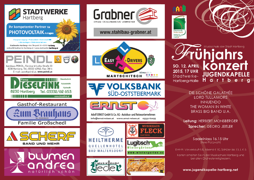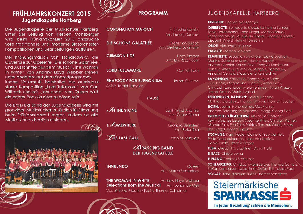 Die Jugendkapelle der Musikschule Hartberg unter der Leitung von Herbert Monsberger wird beim Frühjahrskonzert 2015 anspruchsvolle traditionelle und moderne Blasorchesterkompositionen und Bearbeitungen aufführen.