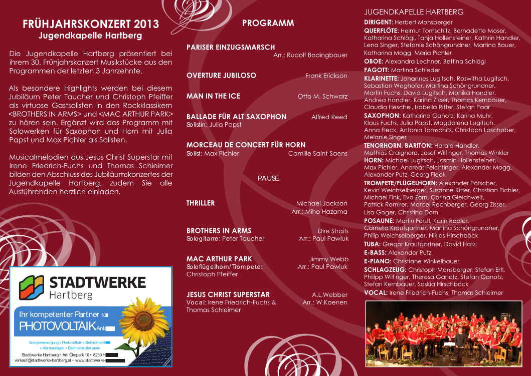 Als besondere Highlights werden beim Jubiläumsfrühjahrskonzert Peter Taucher und Christoph Pfeiffer als virtuose Gastsolisten in den Rockklassiker und zu hören sein. Musicalmelodien aus Jesus Christ Superstar mit Irene Friedrich und Thomas Schleimer bilden den Abschluß des Jubiläumskonzertes der Jugendkapelle in der Stadtwerke Hartberghalle. Vorverkaufskarten gibt es in der Musikschule Hartberg und bei allen Orchestermitgliedern.